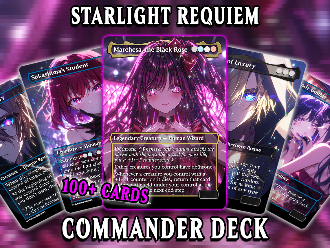 Dive into the dazzling yet tragic world of Oshi no Ko with this unique, hand-crafted Commander deck. Inspired by Ai Hoshino – the idol who captured hearts in a storm – this deck brings her story to the table.