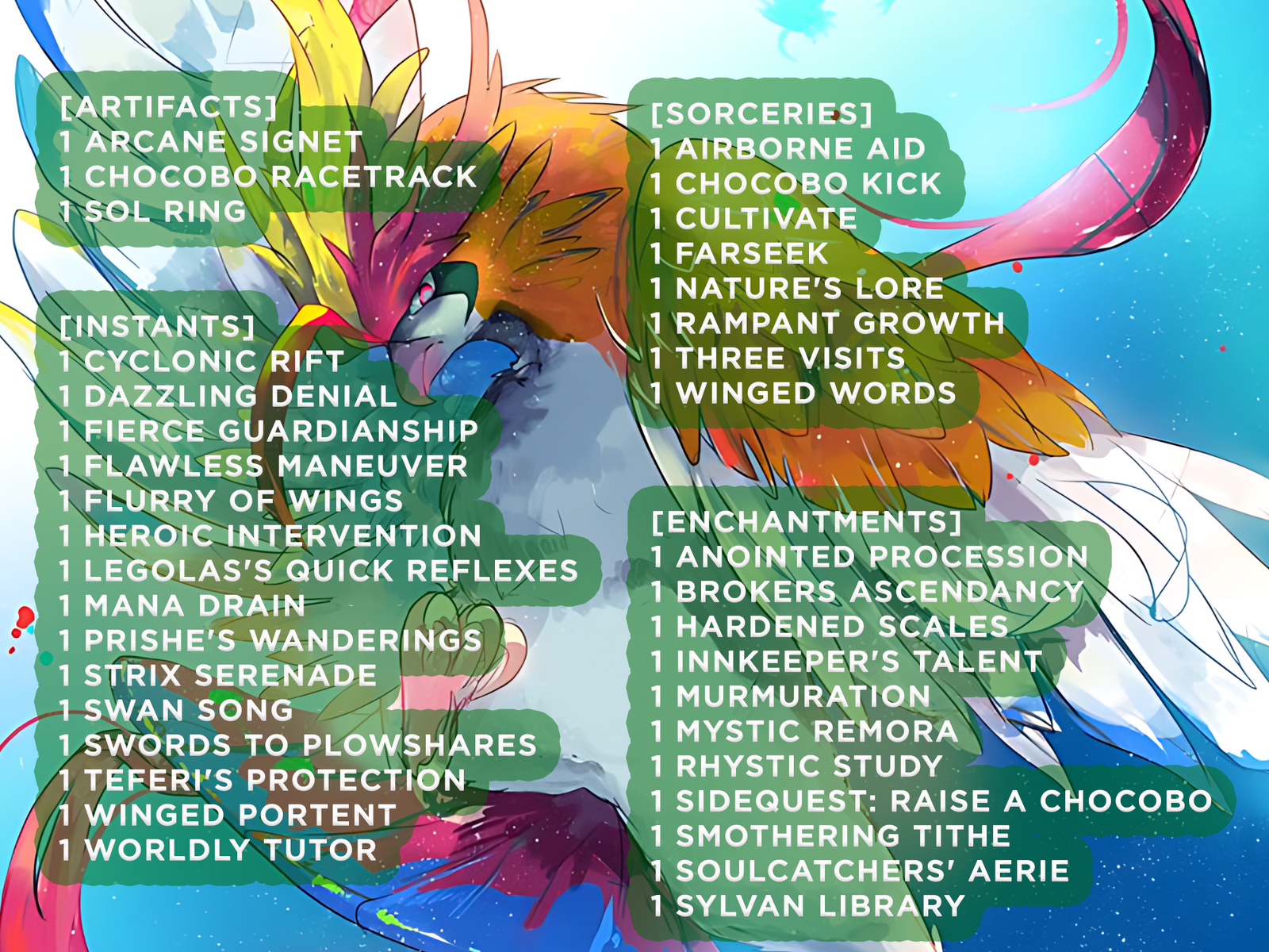 This deck flies over the competition with relentless bird tribal synergy. From Ishai, Ojutai Dragonspeaker to Empyrean Eagle, every creature builds aerial dominance. Counter-doublers like Hardened Scales and anthem effects like Brokers Ascendancy transform your board into a winged armada. With protection spells (Teferi’s Protection, Heroic Intervention) and value engines (Rhystic Study, Mystic Remora), this deck balances resilience, flavor, and competitive edge.