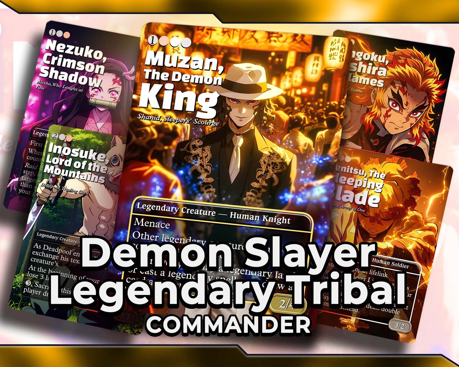 Step into the world of Demon Slayer with this fully themed Legendary Tribal Commander Deck led by Shanid, Sleepers’ Scourge. Every card has been carefully selected and reimagined to fit the Demon Slayer universe, bringing your favorite characters, iconic battles, and haunting demons straight to the table.