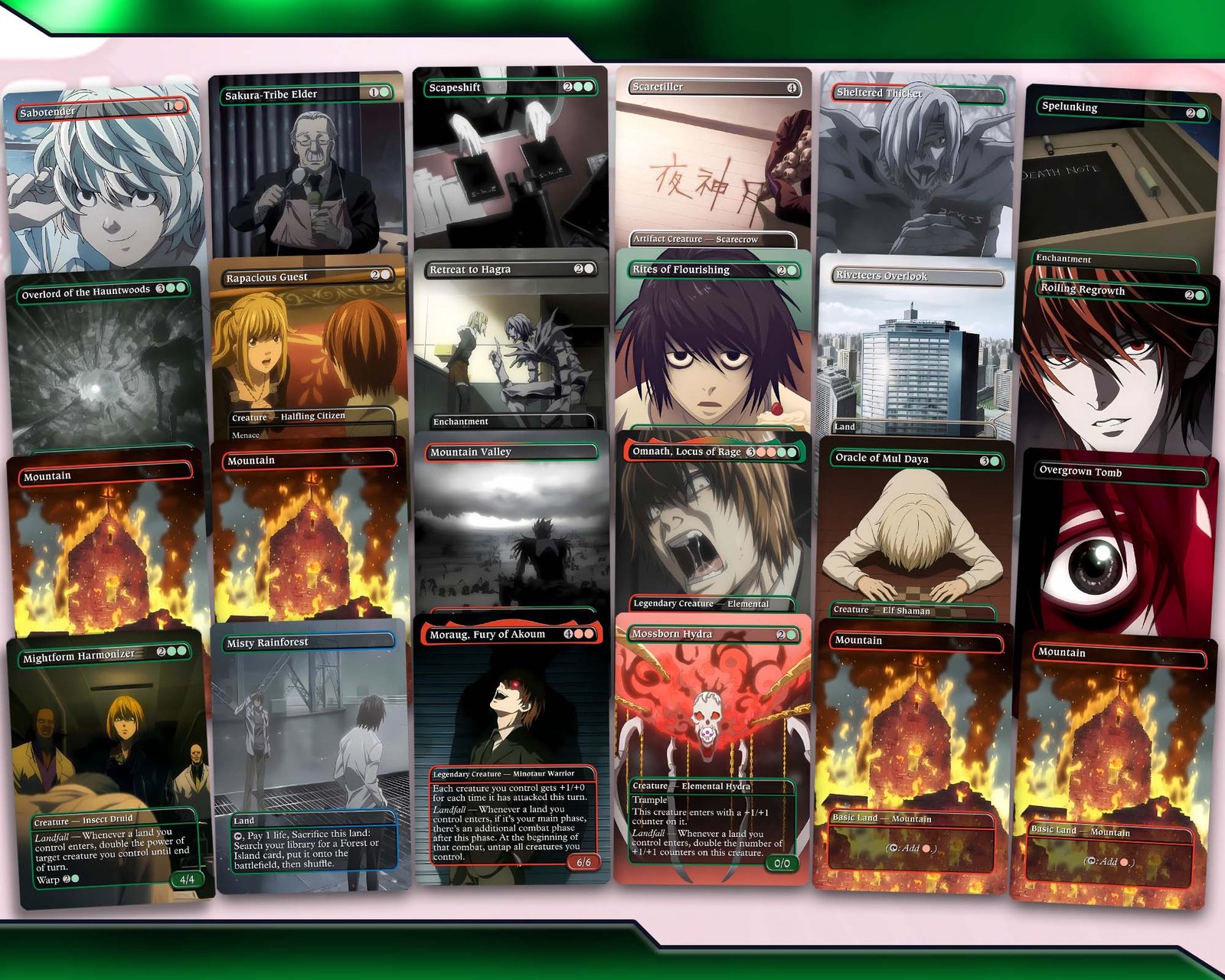Take control of destiny itself with Szarel, Genesis Shepherd, reimagined in the sinister world of Death Note. This deck channels the corrupting power of the land 🌋🌱💀, turning every resource into a weapon. With Lands Matter synergies, recursion, and sacrifice outlets, you’ll grind opponents into submission while fueling inevitability from the grave.